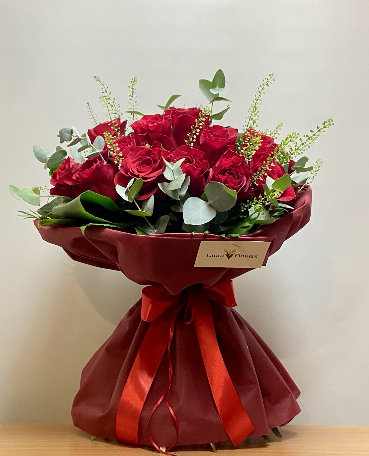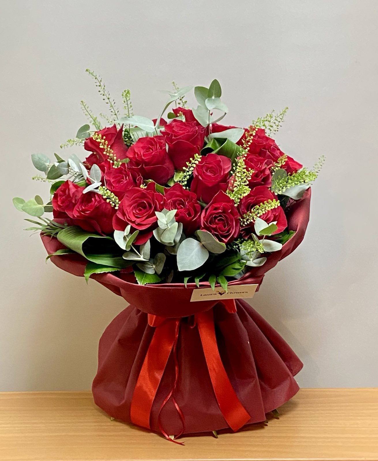 Μπουκέτο με κόκκινα τριαντάφυλλα και φρέσκα φυλλώματα για την τέλεια έκπληξη.