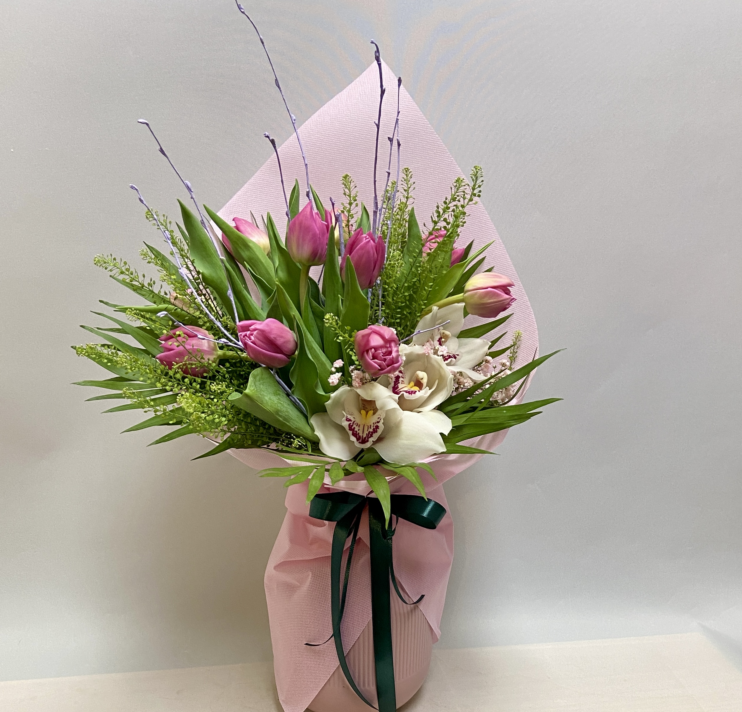 Μπουκέτο με τουλίπες και σιμπιντιουμ ορχιδέες