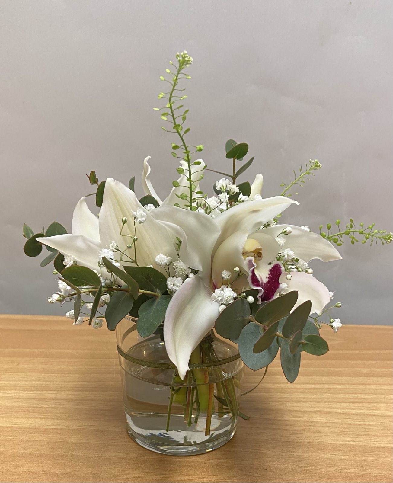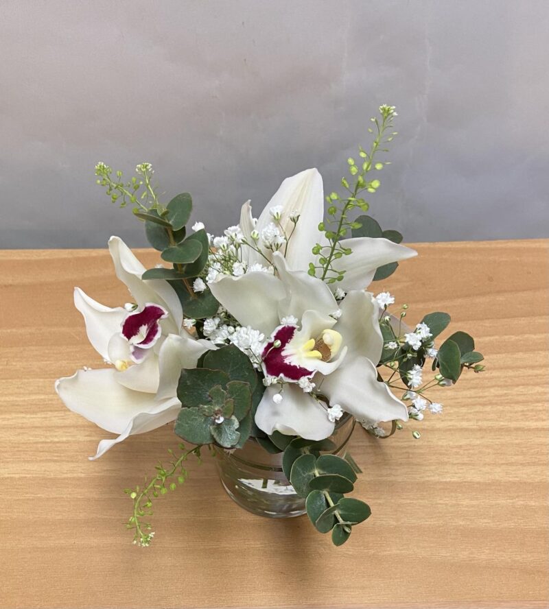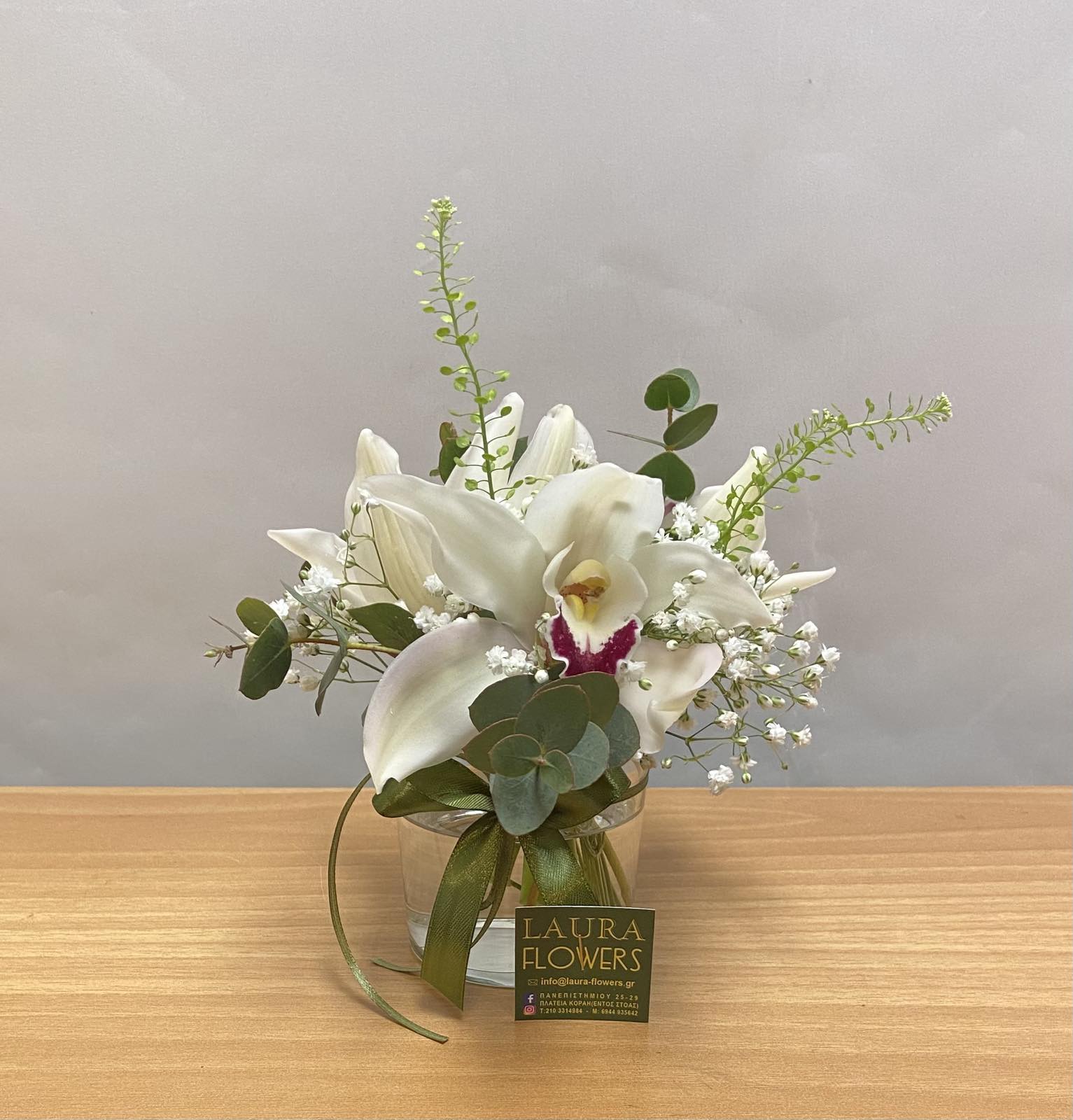 ΣΥΝΘΕΣΗ ΜΕ ΤΡΕΙΣ ΛΕΥΚΕΣ ΟΡΧΔΕΕΣ ΣΕ ΓΥΑΛΙ. Η ΣΥΝΘΕΣΗ ΜΠΟΡΕΙ ΝΑ ΓΙΝΕΙ ΚΑΙ ΜΕ ΑΛΛΑ ΧΡΩΜΑΤΑ ΟΡΧΙΔΕΑΣ.