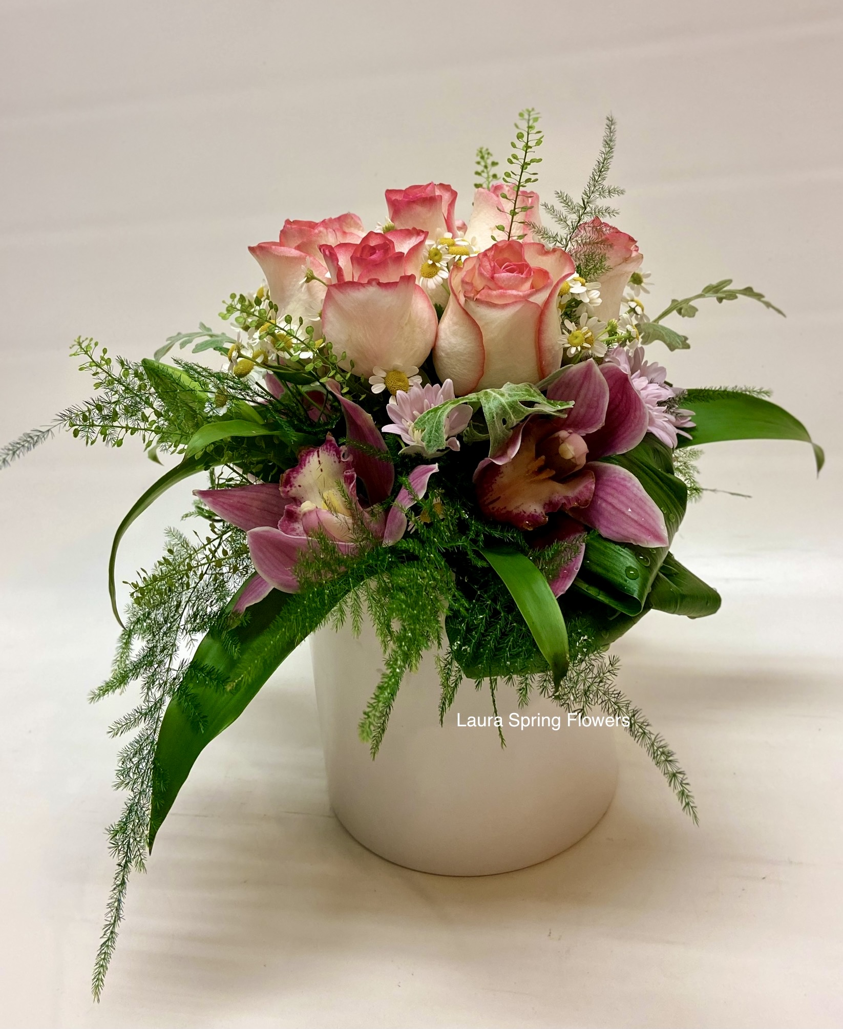 Σύνθεση με ορχιδέες και τριαντάφυλλα σε πήλινο